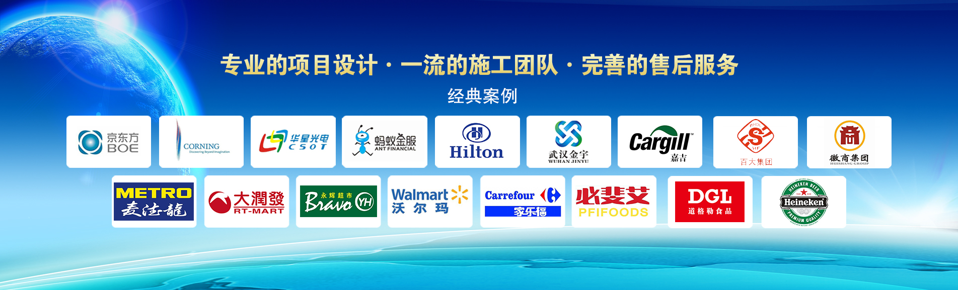 冷凍冷藏設(shè)備大型冷庫(kù)項(xiàng)目: 武漢中百物流冷庫(kù)(40000㎡)、蘇州、北京普洛斯大型物流庫(kù)(17000㎡)、沈陽佳德物流冷庫(kù)(20000㎡)、上海東航配餐物流庫(kù)(6000㎡)、杭州華商勾莊物流冷庫(kù)(24000㎡)、安徽安心蔬菜綠色食品冷庫(kù)(12000㎡)、武漢金宇冷庫(kù)(35000㎡)、必斐艾食品廠(14000㎡)、中國(guó)-東盟(百色)農(nóng)產(chǎn)品交易中心冷庫(kù)物流工程(30000㎡)、遵鐵物流冷鏈物流區(qū)建設(shè)項(xiàng)目中心冷庫(kù)物流工程(16500㎡)、長(zhǎng)沙云冷產(chǎn)業(yè)園冷庫(kù)物流工程(21000㎡)等;大型中央空調(diào)項(xiàng)目: 武漢康寧顯示玻璃廠廠房、武漢京東方模組廠房、武漢華星光電模組廠房、深圳華星光電模組廠房,杭州阿里巴巴辦公樓,舟山波音737機(jī)場(chǎng)辦公樓,南京江北能源站、上海金融大酒店等